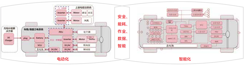通過底盤與上裝的一體化設計,中控屏集成了車輛駕駛、上裝作業和多媒體娛樂等多功能,實現了“一屏多用”,簡化了架構,減少了60%的部件和線束,從而提高了性價比和可靠性