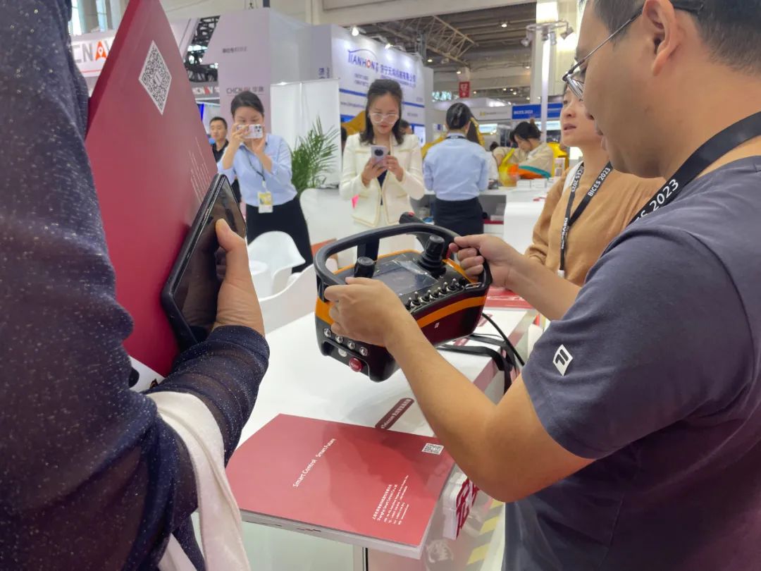 無人化也是本次展會的核心之一,在展臺另一側(cè),多款無線?厴璞敢駁玫攪絲突У墓惴汗刈。eTelecom系列遙控系統(tǒng),發(fā)射器面板可根據(jù)客戶的功能需求進(jìn)行非標(biāo)定制,面板可以安裝單軸?、雙軸遙控、電位計、選擇開關(guān)、撥動開關(guān)等。不僅品質(zhì)可靠,并且采用符合人體力學(xué)的腰跨式設(shè)計,在工程機(jī)械、林業(yè)機(jī)械、港口機(jī)械等領(lǐng)域廣泛應(yīng)用。